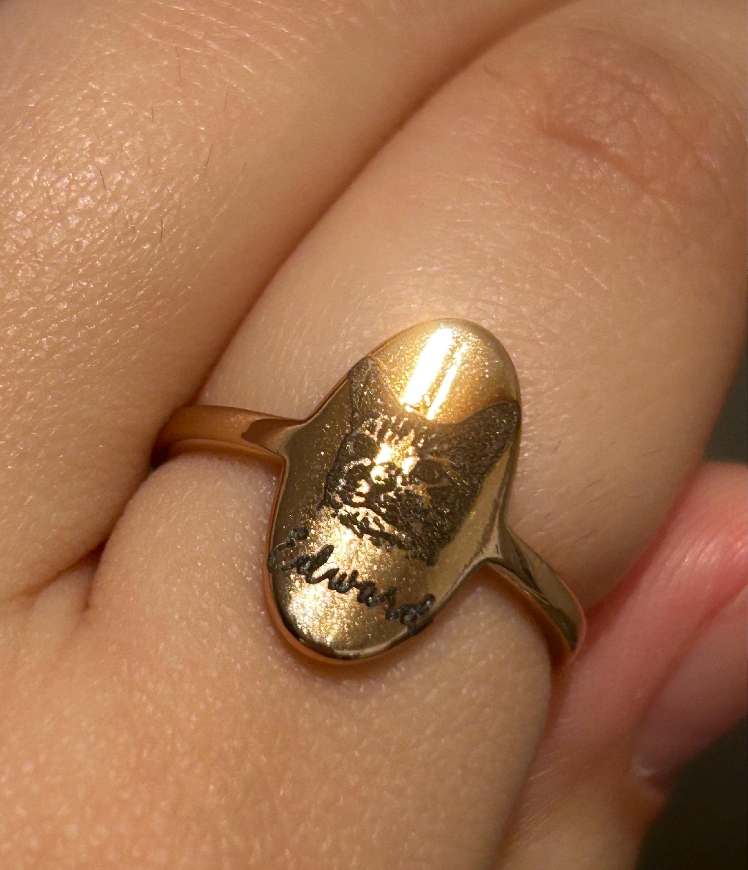 Personalize this ring with your pet's custom portrait and name. Also, select a font to make it extra special. The ring features a dainty oval surface and is the perfect accessory for all occasions. After checking out, please send us a message with 2-3 images. While we are more than willing to engrave any pet portrait you send us, please keep in mind that a well-lit, clear photo will provide the best result. We look forward to making something beautiful!