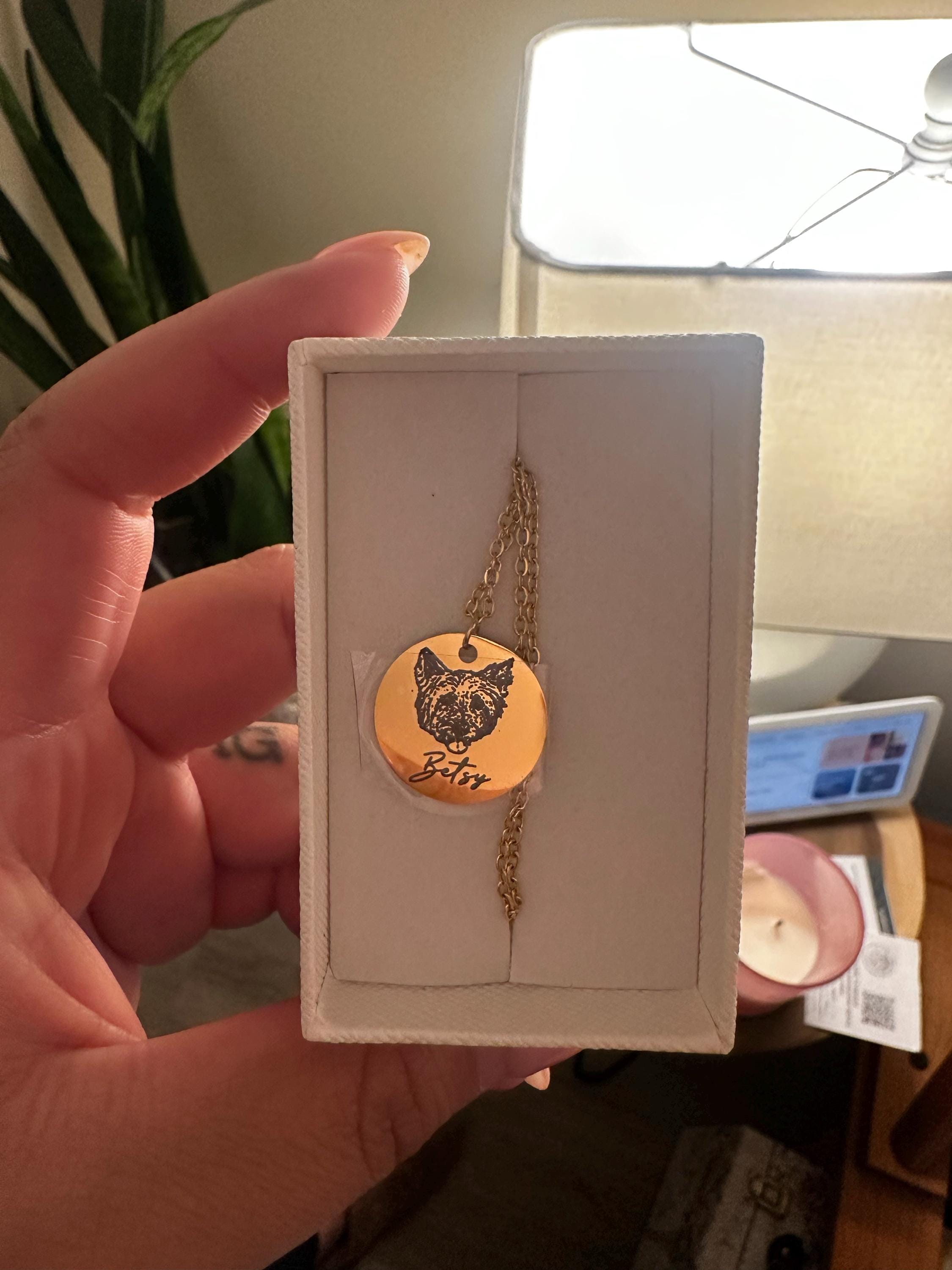 Celebrate the enduring bond with your furry companion through our Personalized Pet Necklace, a heartfelt tribute designed for dog and cat moms. This custom pet portrait memorial gift is a poignant remembrance, capturing the essence of your beloved pet. With three size options, the coin pendant becomes a wearable piece of art, a cherished keepsake in loving memory. Whether as a pet loss gift for someone special or a personal memento for yourself, this pet jewelry beautifully encapsulates the unique connection shared with our four-legged friends. Keep their memory close with this elegantly crafted and custom-made piece, a heartfelt nod to the love that transcends time.