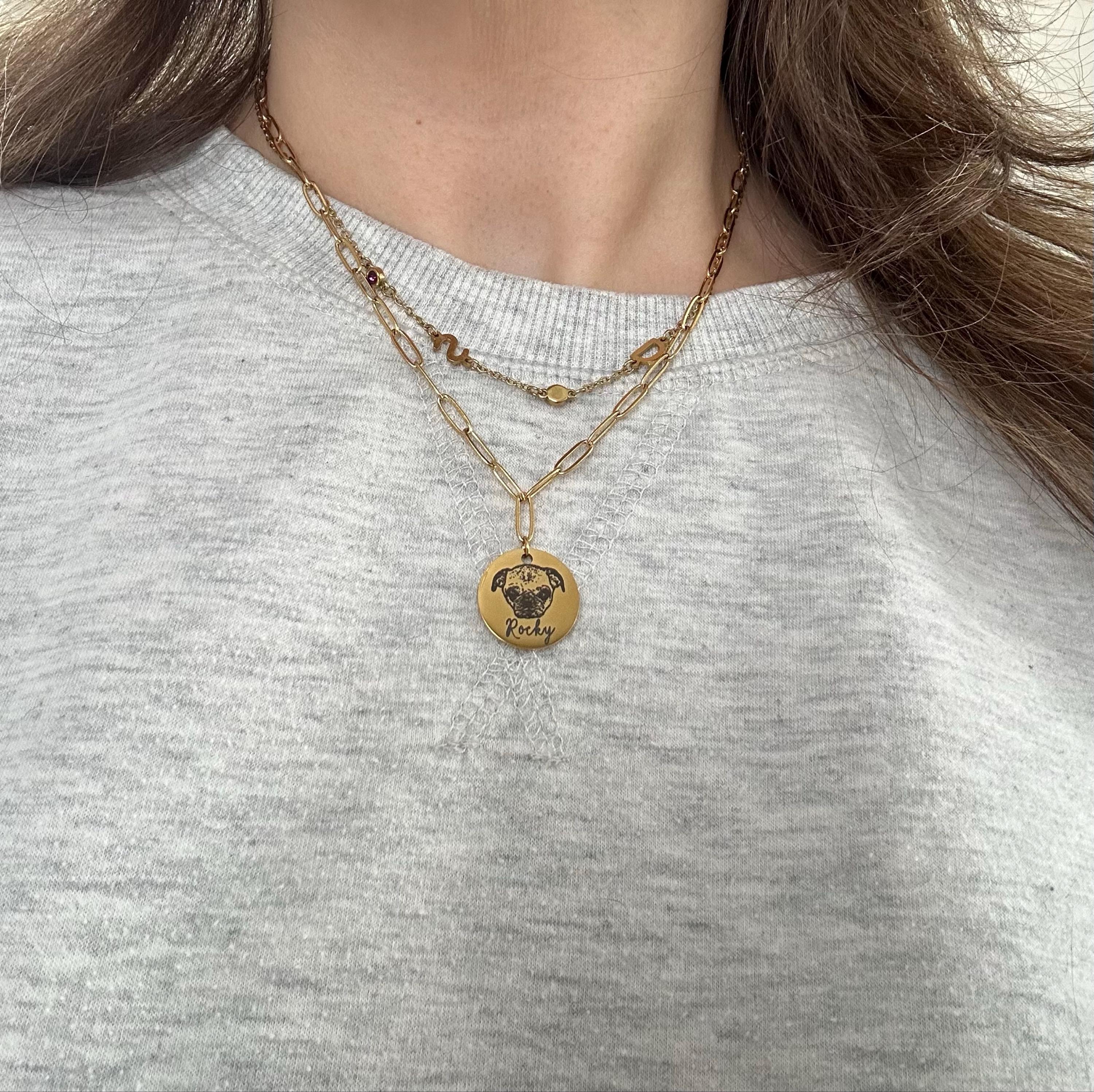 This pet memorial necklace features a single engraved coin pendant on a clip chain, with your pet's portrait on the front and their name underneath — up to 10 characters. Choose single-sided for the portrait and name only, or go double-sided and add a short message on the back like "forever loved," "always with me," or a date. The coin is approximately 0.71" in diameter on a 17.5" clip chain, available in gold, silver, or rose gold plated stainless steel that's tarnish-resistant and hypoallergenic.