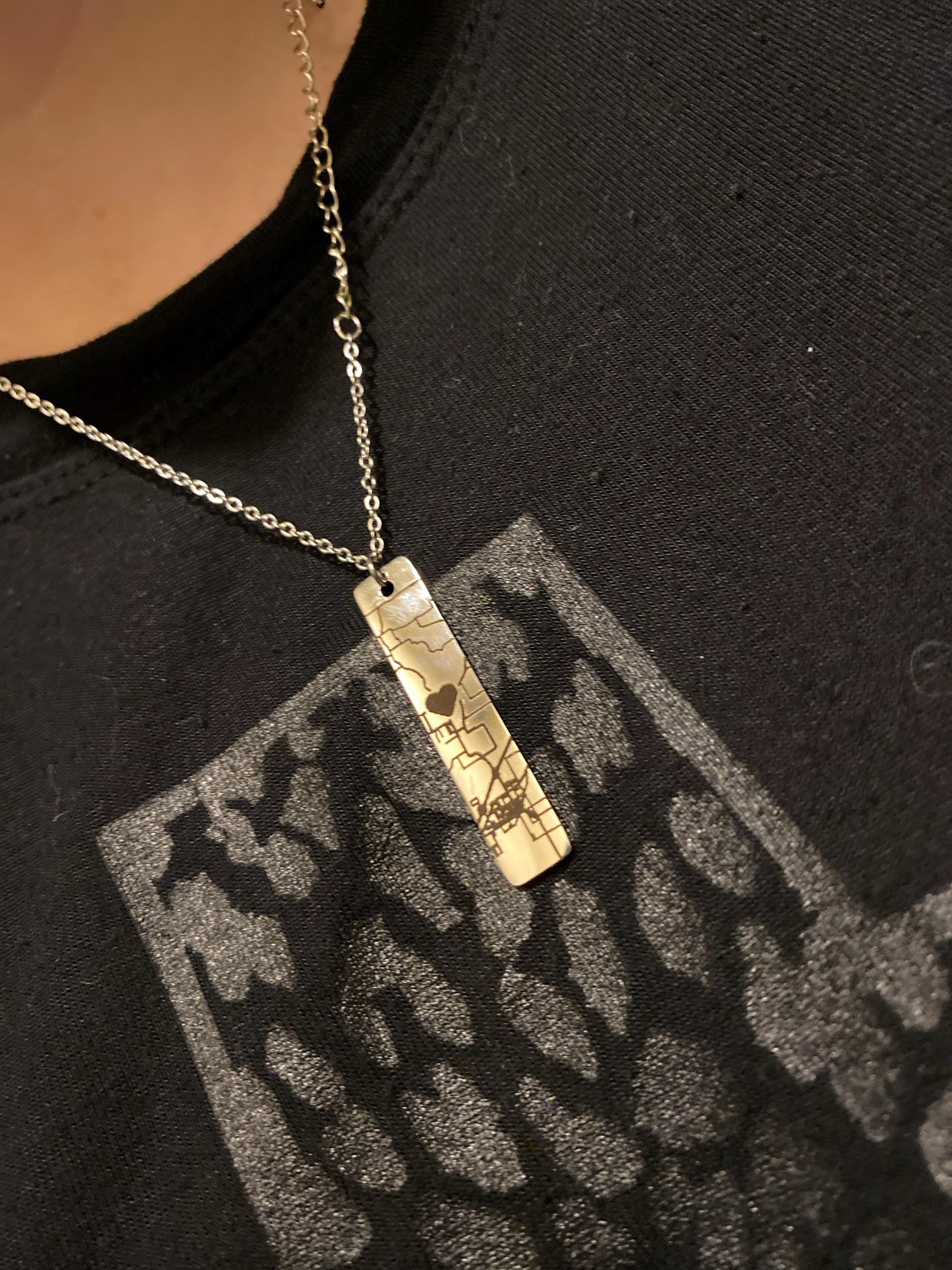 This vertical bar necklace can be personalized with a map of your special place! It is the perfect way to keep them close to your heart! It makes perfect gifts for any occasions such as birthday, thanksgiving, 1 year anniversary, Valentines day, Christmas, family reunion, and more!